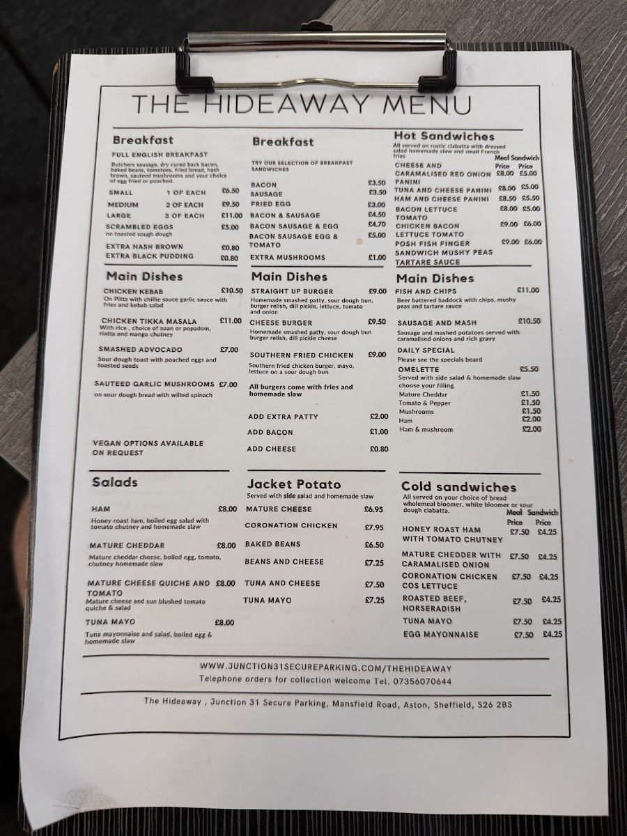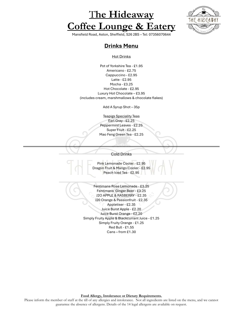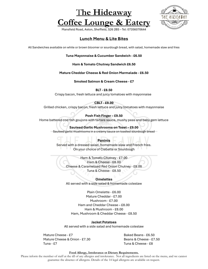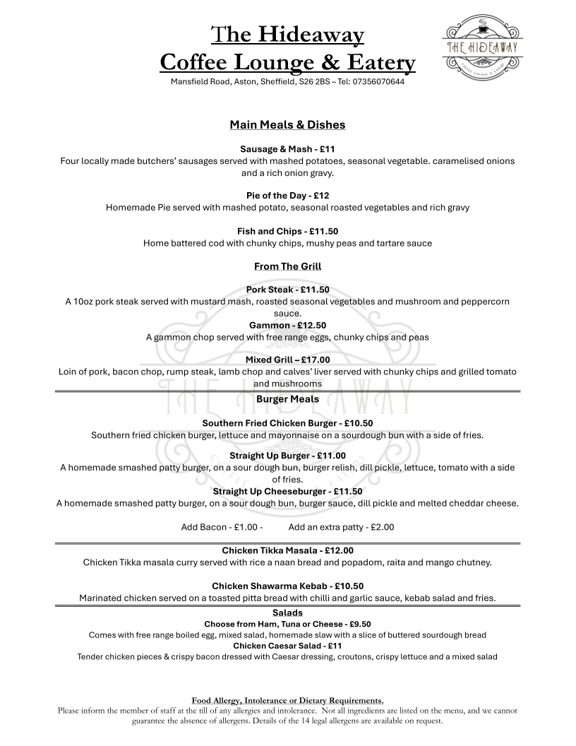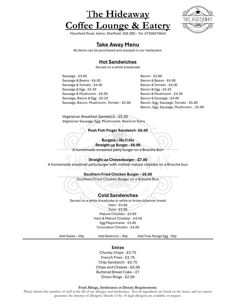 Welcome to The Hideaway Coffee Lounge & Eatery, a charming cafe situated on Mansfield Rd, Aston, Sheffield. This hidden gem offers a delightful menu that celebrates both comfort food and homemade goodness. With an inviting atmosphere, it’s perfect for travelers and locals alike.
